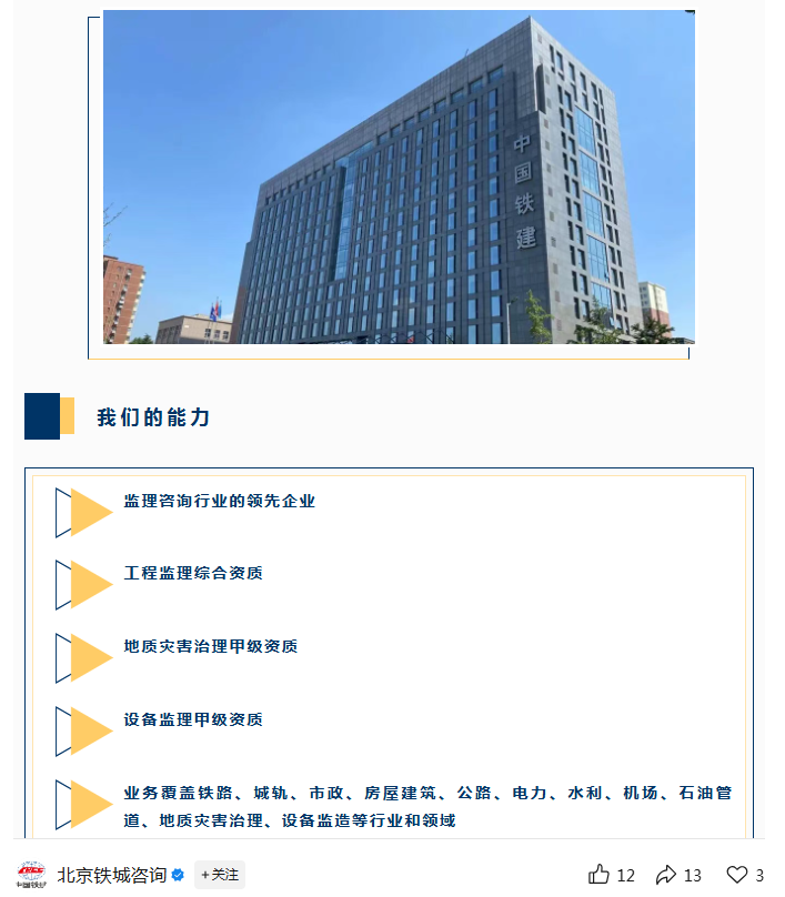 据其官方微信公众号“北京铁城咨询”介绍,公司为监理咨询行业的领先企业,业务覆盖铁路、城轨、市政、房屋建筑、公路、电力、水利、机场、石油管道、地质灾害治理、设备监造等行业和领域,拥有工程监理综合资质、地质灾害治理甲级资质、设备监理甲级资质等。