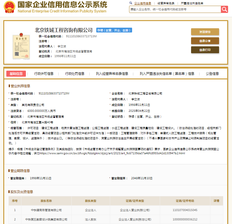 国家企业信用信息公示系统显示,北京铁城工程咨询有限公司成立于1998年,注册资本6000万元人民币,法定代表人李立波,大股东为中铁第五勘察设计院集团有限公司。
